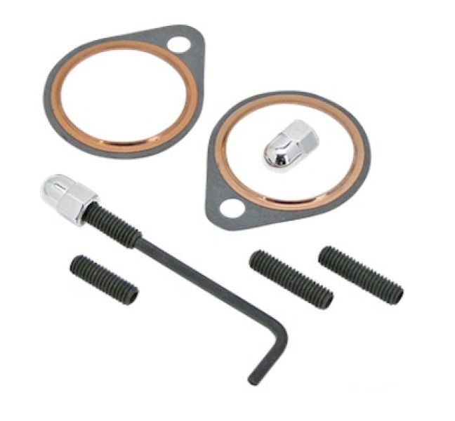 james Auspuff-Stehbolzenkit mit 2 kurzen Stehbolzen für die frühen Zylinderköpfe und 2 langen Stehbolzen für die späteren Zylinderköpfe, 2 Firering Auspuffdichtungen und 2 verchromten Hutmuttern. Für Shovelheads 1966-1984.