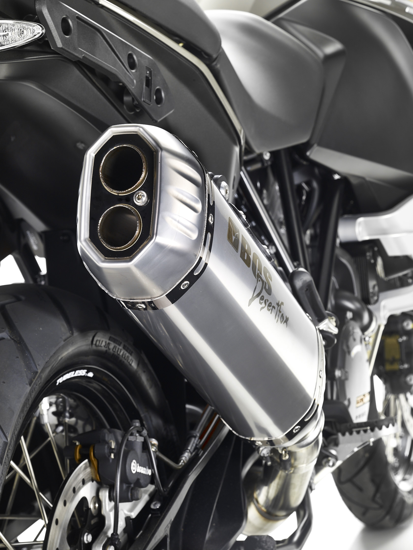 The BOS Desert Fox slip-on rear silencer has a beautiful, deep, rich sound. All mounting materials are included. An E-number is engraved on the silencer, which serves as proof of approval. Thanks to its high-quality workmanship, the BOS Desert Fox is a real eye-catcher on the KTM 1190 Adventure