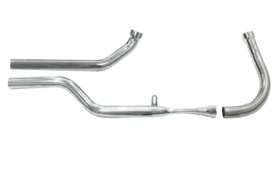 Chrome. S-pipe. Rigid frame. For use with universal mufflers. No slider channels. Use 512595 P-clamp to mount. Heatshield rear 903403. Note: The S-pipe system is a 2-piece front header, like OEM, which is flattened to fit between generator and frame tube for improved ground clearance in right turns. Note: Heatshields must be ordered separately when required. When heatshields are not mentioned they are not available.