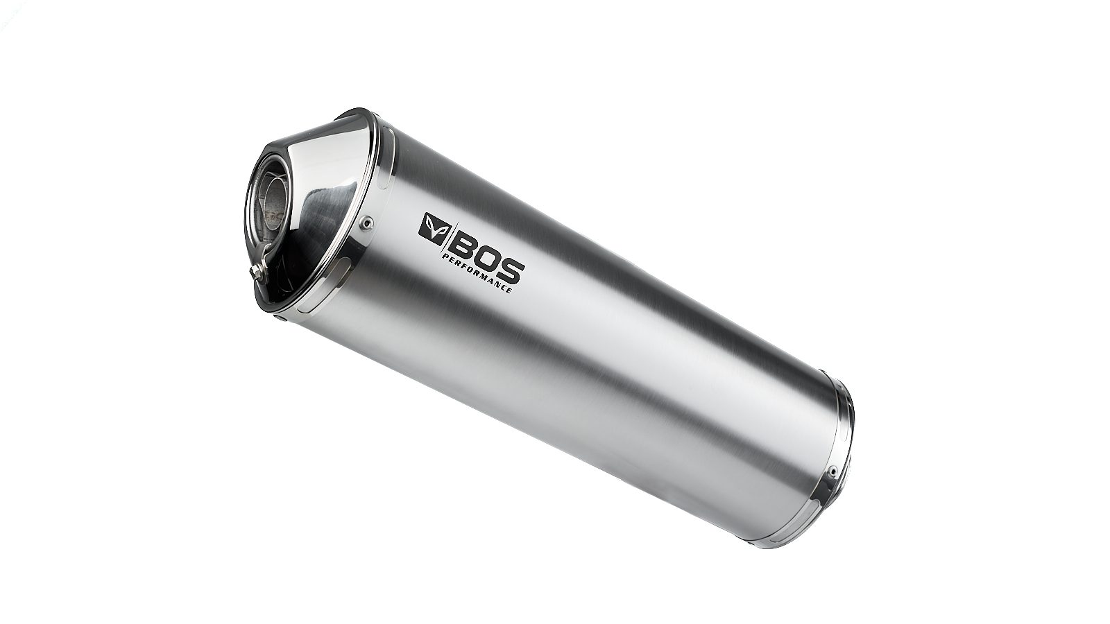 The BOS oval slip-on rear silencer has a beautiful, deep, rich sound. The DB-Eater is removable and all necessary mounting materials are included. An E-number is engraved on the silencer, which serves as proof of approval. Thanks to its high-quality workmanship, the BOS oval rear silencer is a real eye-catcher on the GSF 650 Bandit.