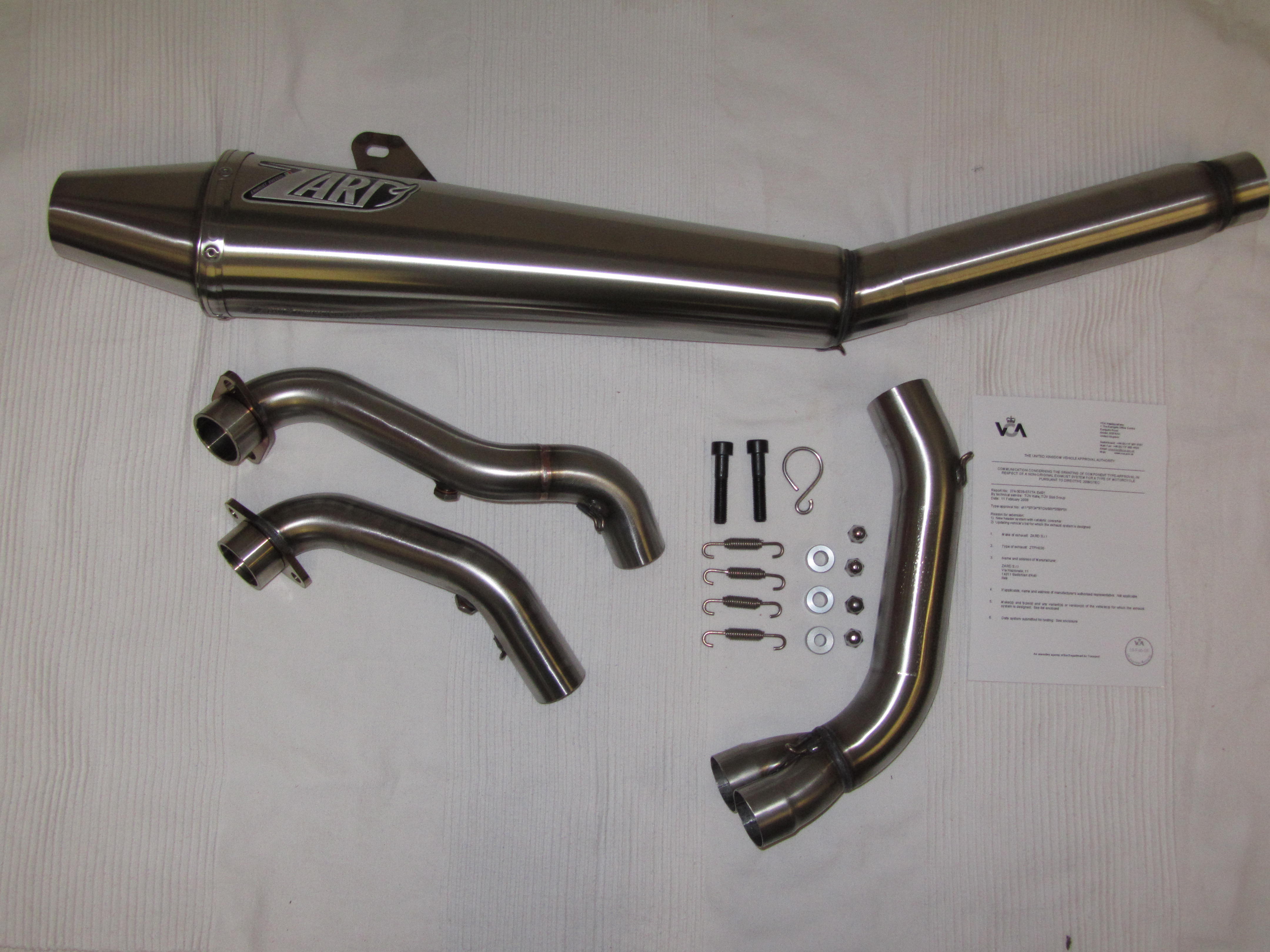 The Zard conical Full Kit 2-1 system has a beautiful, deep, and rich sound. The DB-Eater can be removed. All mounting materials are included. Performance and torque curve are improved compared to the original. The weight saving is 2.45 kg. The EC-approved rear silencers have an engraved E-number and do not need to be entered in the vehicle documents. Thanks to its high-quality workmanship, the Zard conical 2-1 complete system is a real eye-catcher on the Triumph Bonneville.
